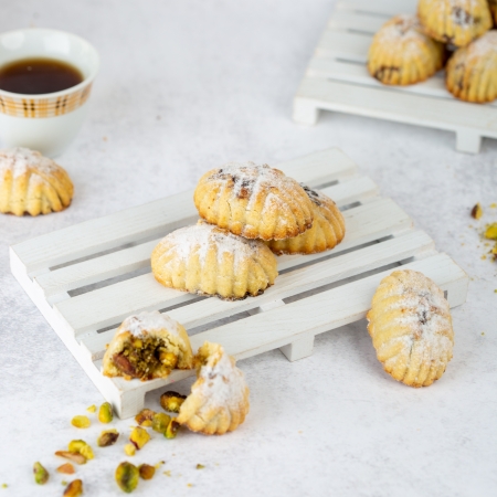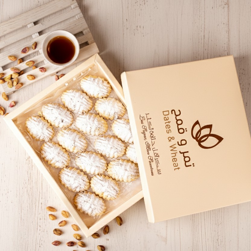 معمول الفستق من تمر و قمح – معمول فاخر مصنوع من السميد ومحشو بفستق حلبي مطحون ومختار بعناية. نكهته غنية وملمسه هش، يقدّم لك تجربة شرقية أصيلة بكل قضمة.